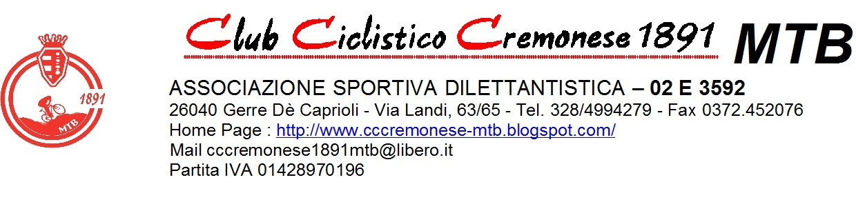 - Versando la quota mediante bonifico bancario sul conto corrente intestato a CLUB CICLISTICO CREMONESE 1891 MTB GRUPPO ARVEDI ASD– Via Landi, 63/65–26040 GERRE DE’ CAPRIOLI (CR)– IBAN IT87S0200811400000041372798 oppure mediante bollettino CC Postale n.000098800717 intestato a Marco Zanacchi ed in seguito inviando al fax n.0285964420 il modulo di iscrizione debitamente compilato unitamente a copia della ricevuta di versamento della quota.